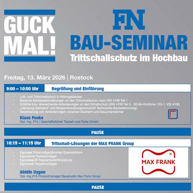 | | Bau-Schulung "Trittschall-dämmung im Hochbau" am 13.03.2026 in Rostock | Bauaufsichtliche Vorgaben kennen. Praxismängel vermeiden. Moderne Systemlösungen umsetzen. #savethedate #guckmal | | |