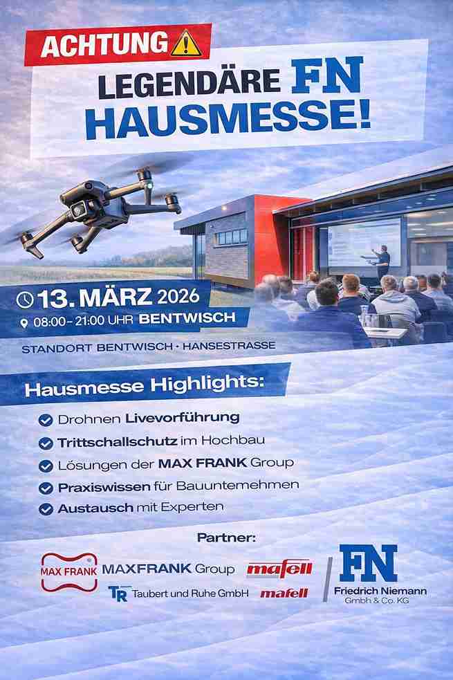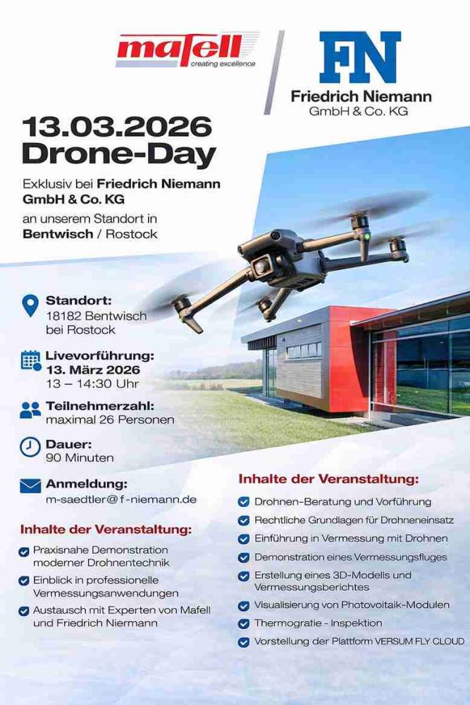 Wir zeigen darüber hinaus die Erstellung von 3D-Modellen und Vermessungsberichten, die Visualisierung von Photovoltaik-Modulen, Thermografie-Inspektionen sowie die Plattform VERSUM FLY CLOUD. Natürlich kommt auch der persönliche Austausch mit den Experten von Mafell und Friedrich Niemann nicht zu kurz.
