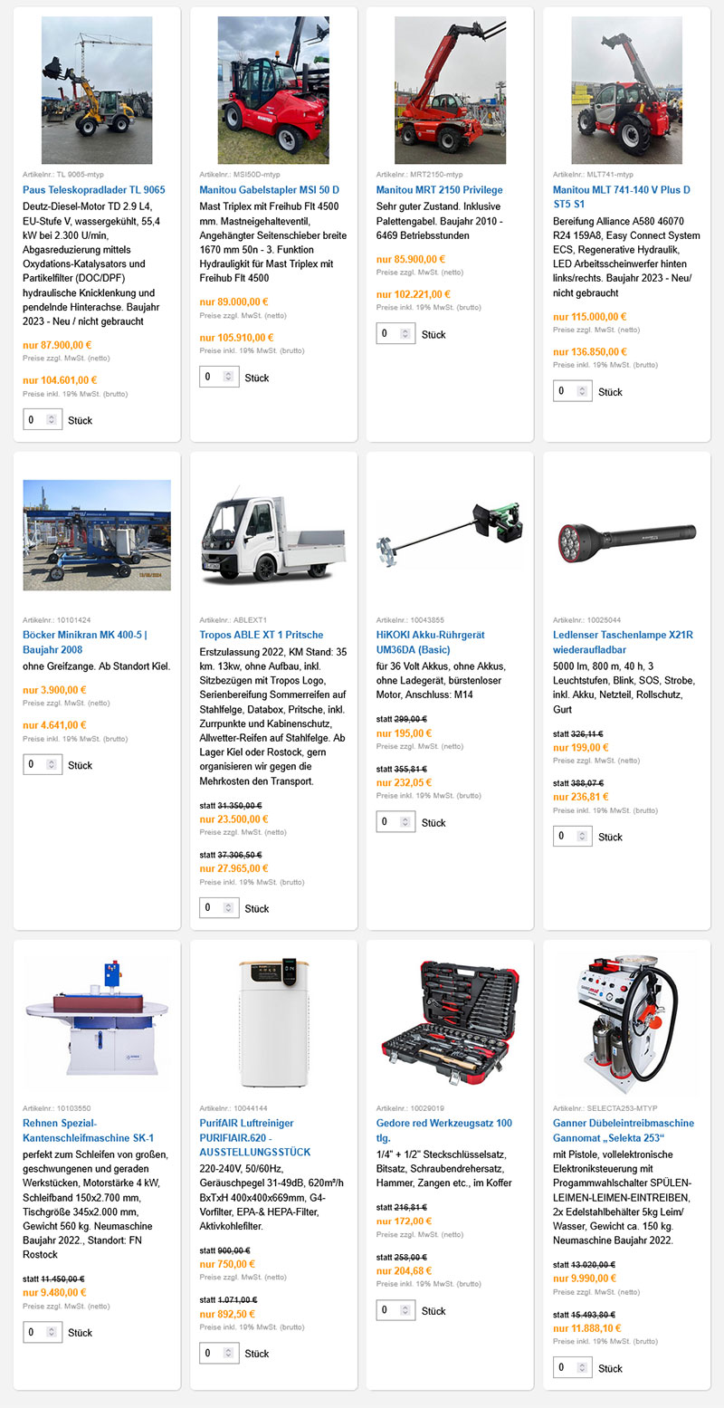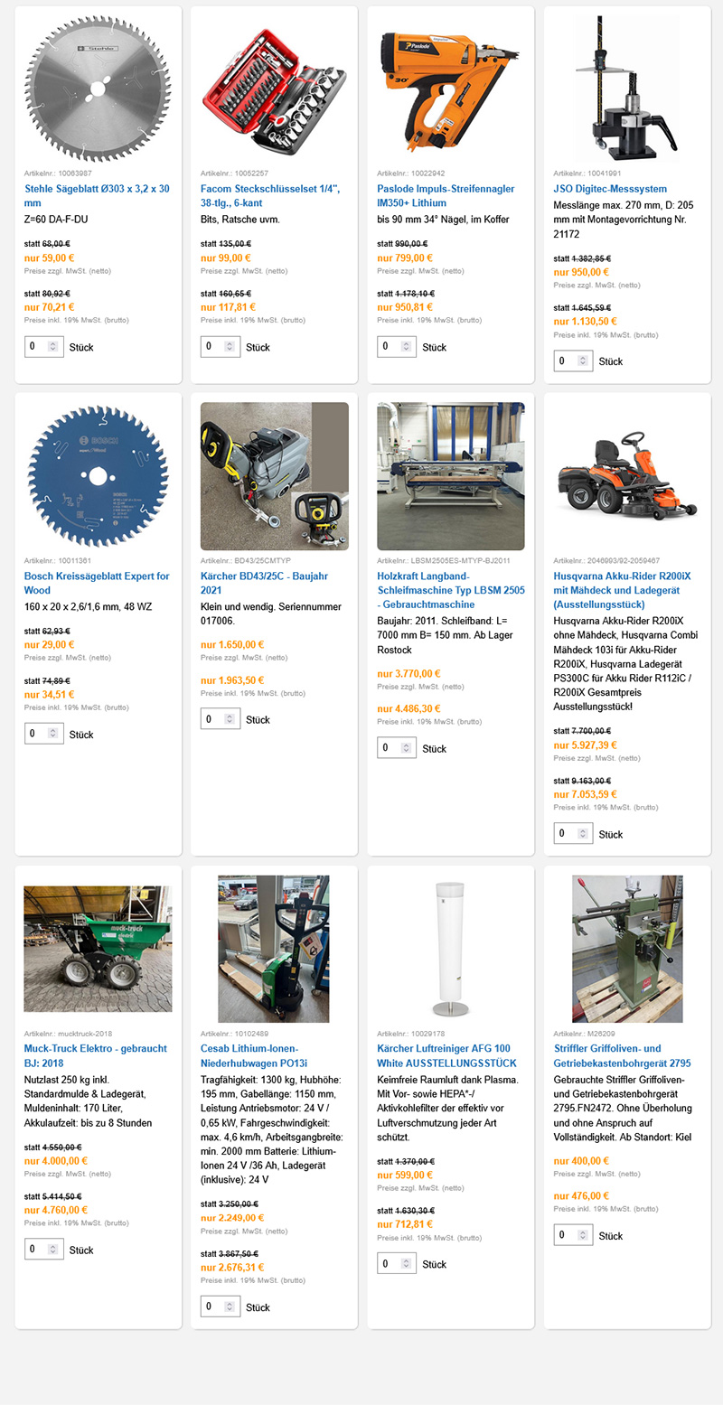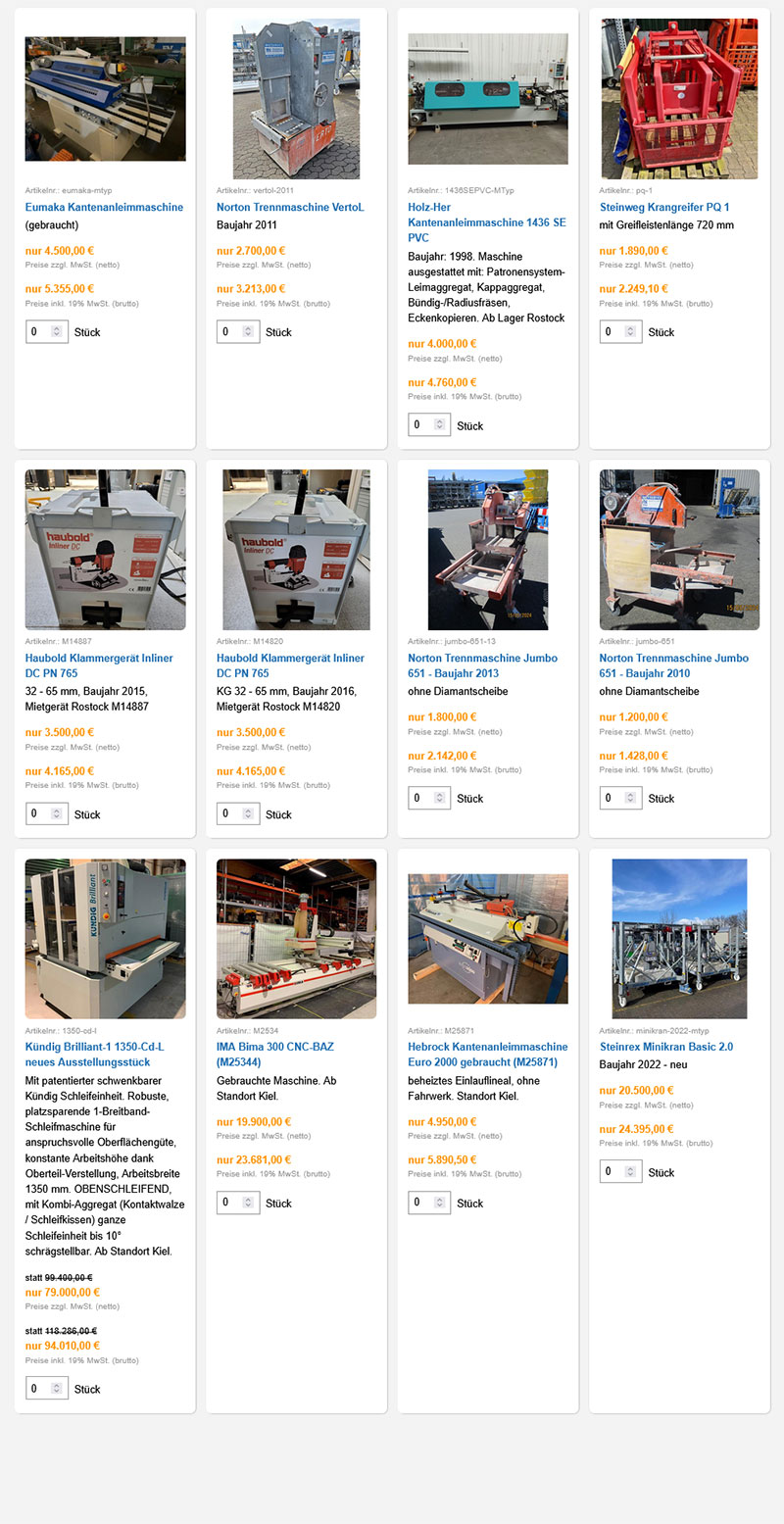 | | Preisstellung | Preise zzgl. Versandkosten von 9,50 € netto / 11,31 € brutto. Bei Großmaschinen zzgl. anfallender Frachtkosten.